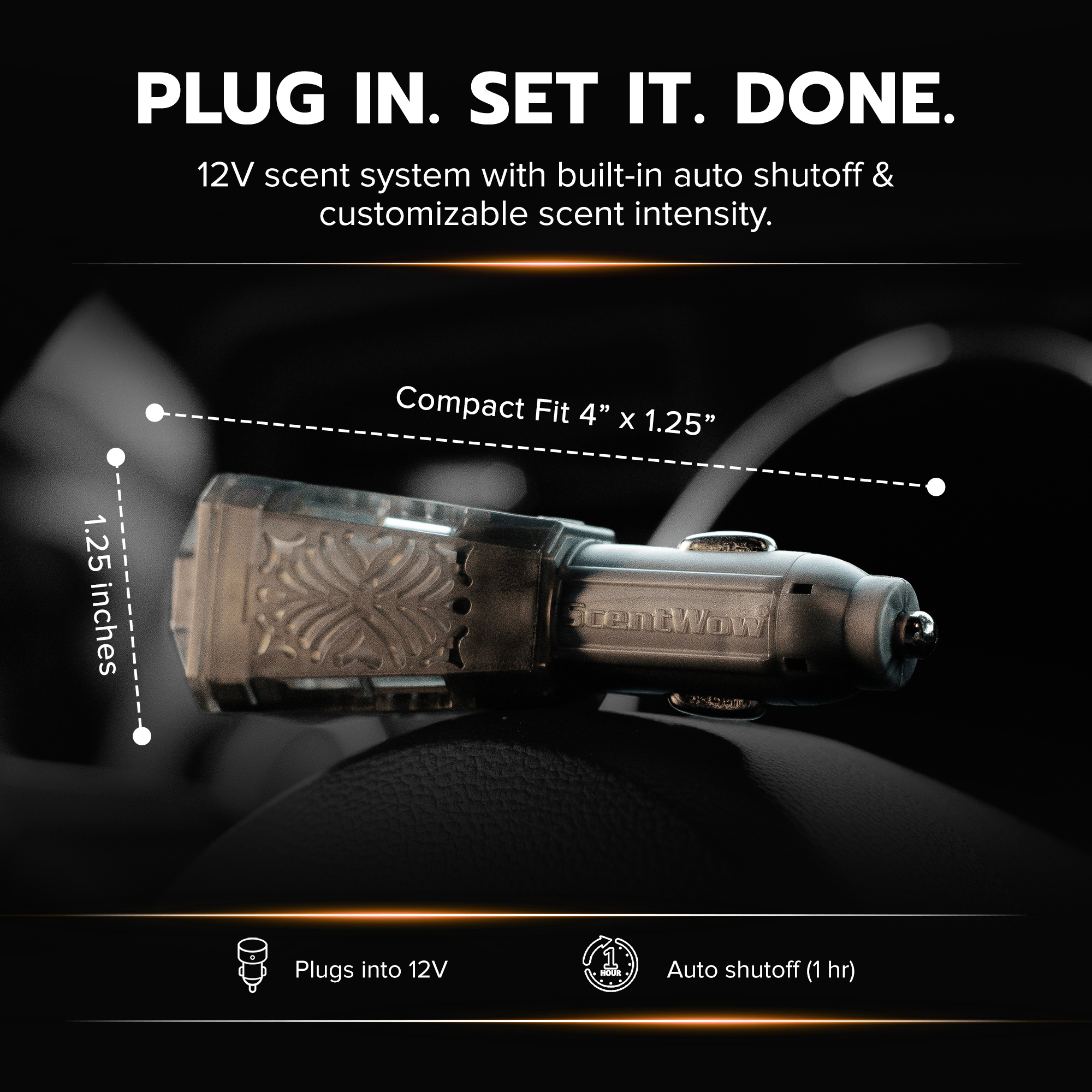 ScentWow plugs directly into your car’s 12V outlet and uses controlled heated diffusion to evenly disperse fragrance. With a quick dip, the no-touch cartridge saturates and releases scent for up to 10 days per cartridge, while each fragrance oil bottle delivers over 30 days of use.